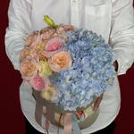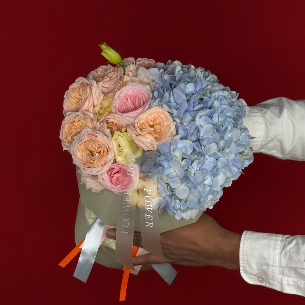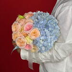 Eustoma - 2 pcs rose - 2 pcs spray roses - 2 pcs hydrangeas light blue - 1 pcs