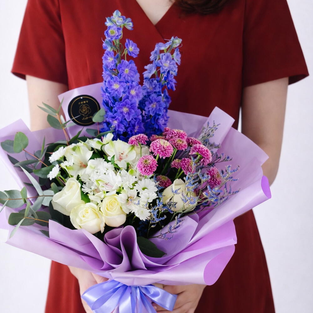A unique premium bouquet combining fresh whites with vibrant blue tones. Featuring elegant white roses, white chrysanthemums, alstroemeria, bright pink button chrysanthemums, tall blue delphinium, and soft purple fillers, finished with eucalyptus greenery and wrapped in luxury lilac wrapping with satin ribbon. Perfect for birthdays, congratulations, thank you gifts, or a stylish surprise. Single Roses (white): 4 pcs Chrysanthemum (white daisy mums): 3 stems Alstroemeria (white): 2 stems Button chrysanthemum (pink): 2 stems Delphinium (blue): 2 stems Statice / limonium (blue filler): 2 stems Eucalyptus greenery: 3 stems Purchase Note: Free Greeting Card Printing included with every order. (Please write your card message at checkout.) Flower Color Changes: You may request to change the flower colors to match your preference. This is subject to availability and may vary depending on daily stock. Add-Ons Available: You can add extra items such as: Balloons, letters, numbers, chocolates, perfumes, and gift items (optional). Freshness Guarantee: We always use fresh flowers and ensure the best possible arrangement quality.