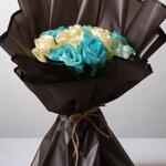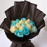 Strikingly modern and full of contrast, this Blue and White Rose Bouquet is a bold floral statement perfect for birthdays, graduations, congratulations, or corporate gifting. Featuring 15 fresh roses – 7 in vibrant dyed blue and 8 in soft creamy white – the bouquet is wrapped in sleek black paper and tied with rustic jute string for a natural finish. Its clean color scheme and dramatic presentation make it a versatile gift with high visual impact. Care Instructions: To extend the life of your bouquet, trim each rose stem diagonally under water and place them in a clean vase filled with fresh, cool water. Keep the arrangement in a cool space away from sunlight, drafts, or heat. Change the water daily and remove any wilting petals. Blue-dyed roses should be handled gently to preserve their color and freshness.