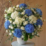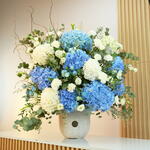 This stunning arrangement features a lush blend of blue and white hydrangeas, beautifully complemented by delicate roses and fresh greenery. The vibrant blue hydrangeas bring a pop of color, while the white blooms add a touch of elegance, creating a harmonious display perfect for any setting. Arranged in a classic vase, this floral masterpiece is ideal for expressing appreciation, celebrating special moments, or simply adding a touch of sophistication to your space. Perfect for home decor, corporate events, or as a thoughtful gift.