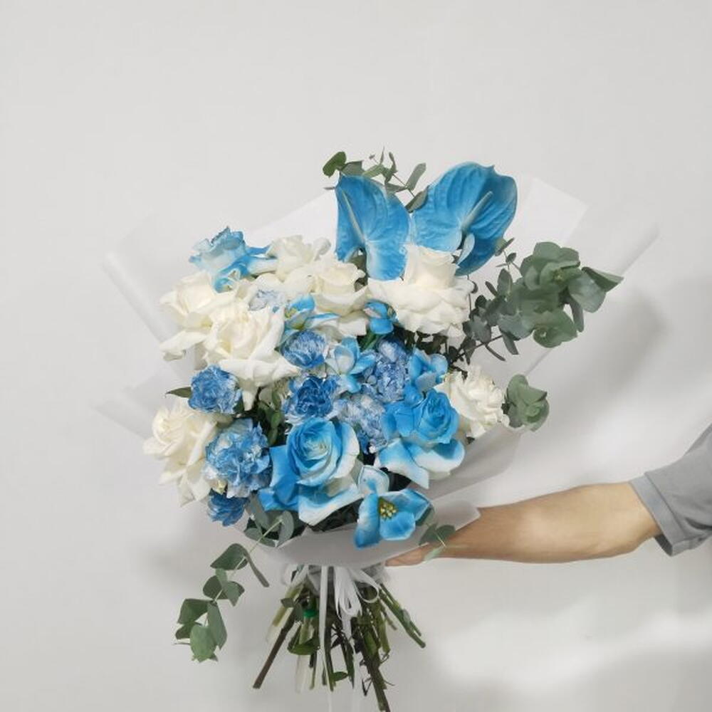 Blueberry Bliss Bouquet – Blue and White Floral Arrangement Celebrate elegance with our Blueberry Bliss Bouquet, a stunning arrangement that combines the calming tones of blue anthuriums, blue-tinted roses, and white florals. Accented with fresh eucalyptus greenery, this bouquet exudes a refreshing and sophisticated vibe, perfect for any occasion from anniversaries to special events. The unique blend of blue and white flowers symbolizes tranquility and grace, making it a memorable gift for loved ones or a sophisticated addition to your own space. Hand-tied with a sleek white ribbon, this bouquet is designed to impress with its enchanting color palette and refined beauty.