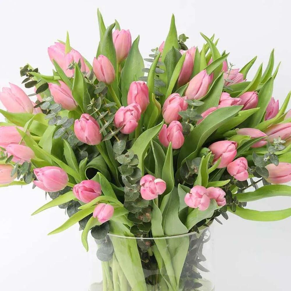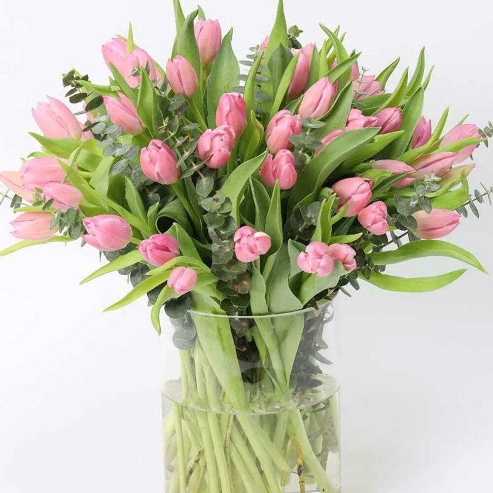 51 Pink Tulips 3 Stems Eucalyptus Prepared in Cylinder Vase
