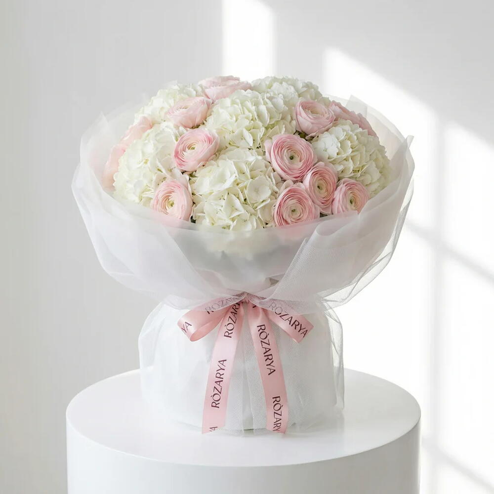 A soft and elegant bouquet in white and blush pink shades, designed with fluffy hydrangea and delicate ranunculus. Romantic, airy, and refined, this bouquet is a beautiful choice for birthdays, Mother’s Day, and thoughtful gifting.
