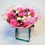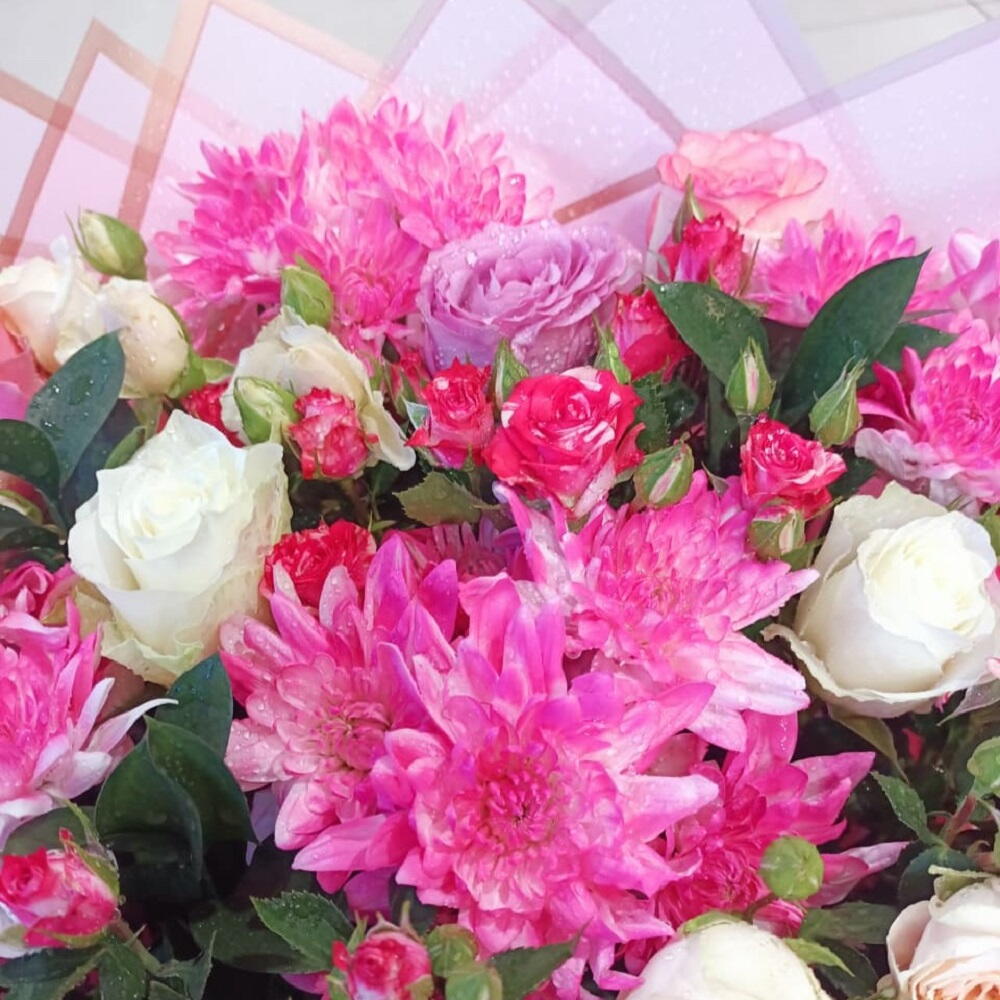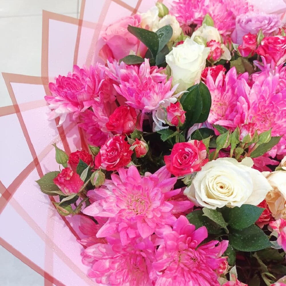 A graceful bouquet of soft pink chrysanthemums and elegant roses, beautifully wrapped in delicate pastel layers—perfect for expressing love, appreciation, and heartfelt emotions on any special occasion.