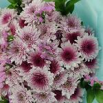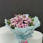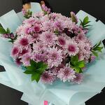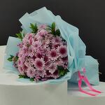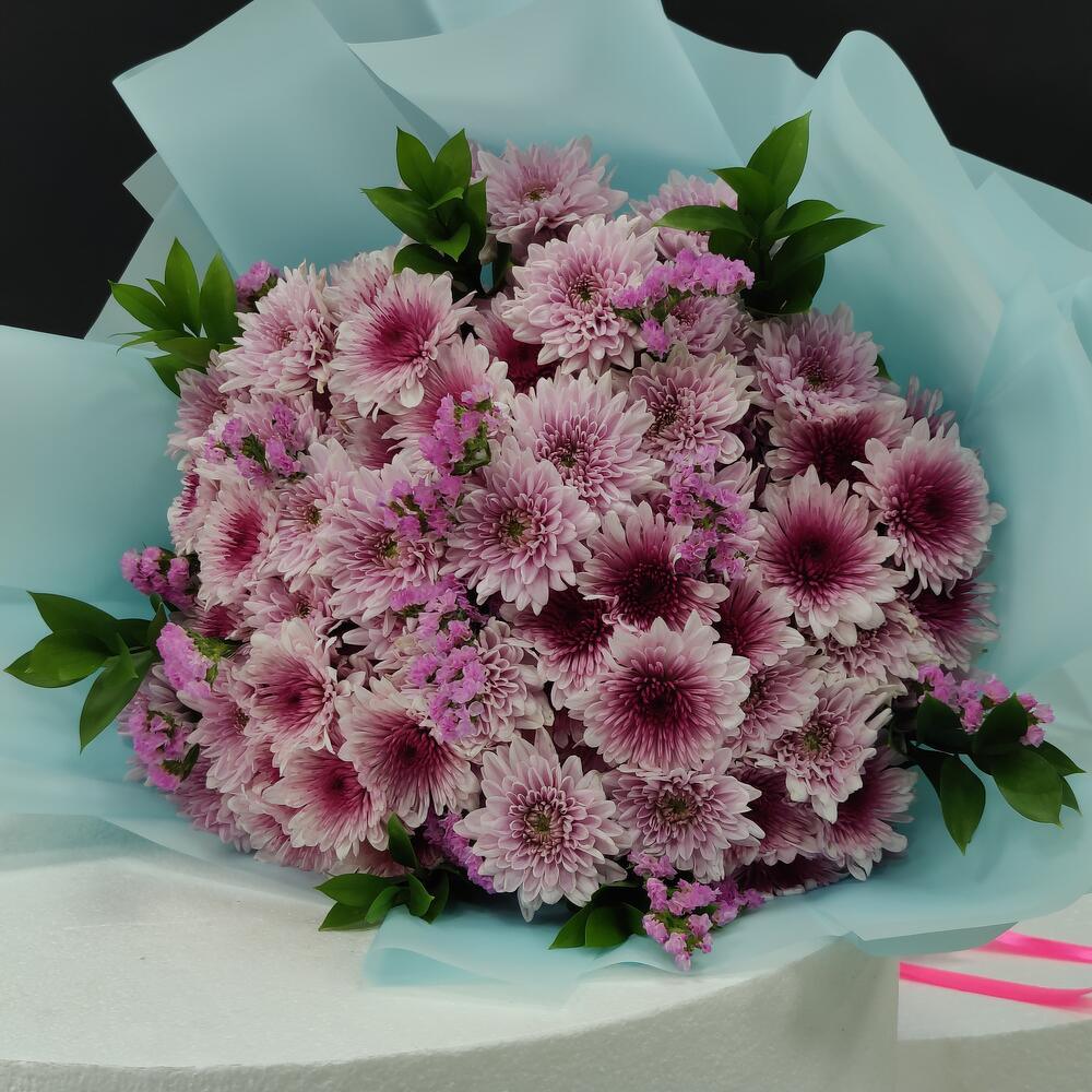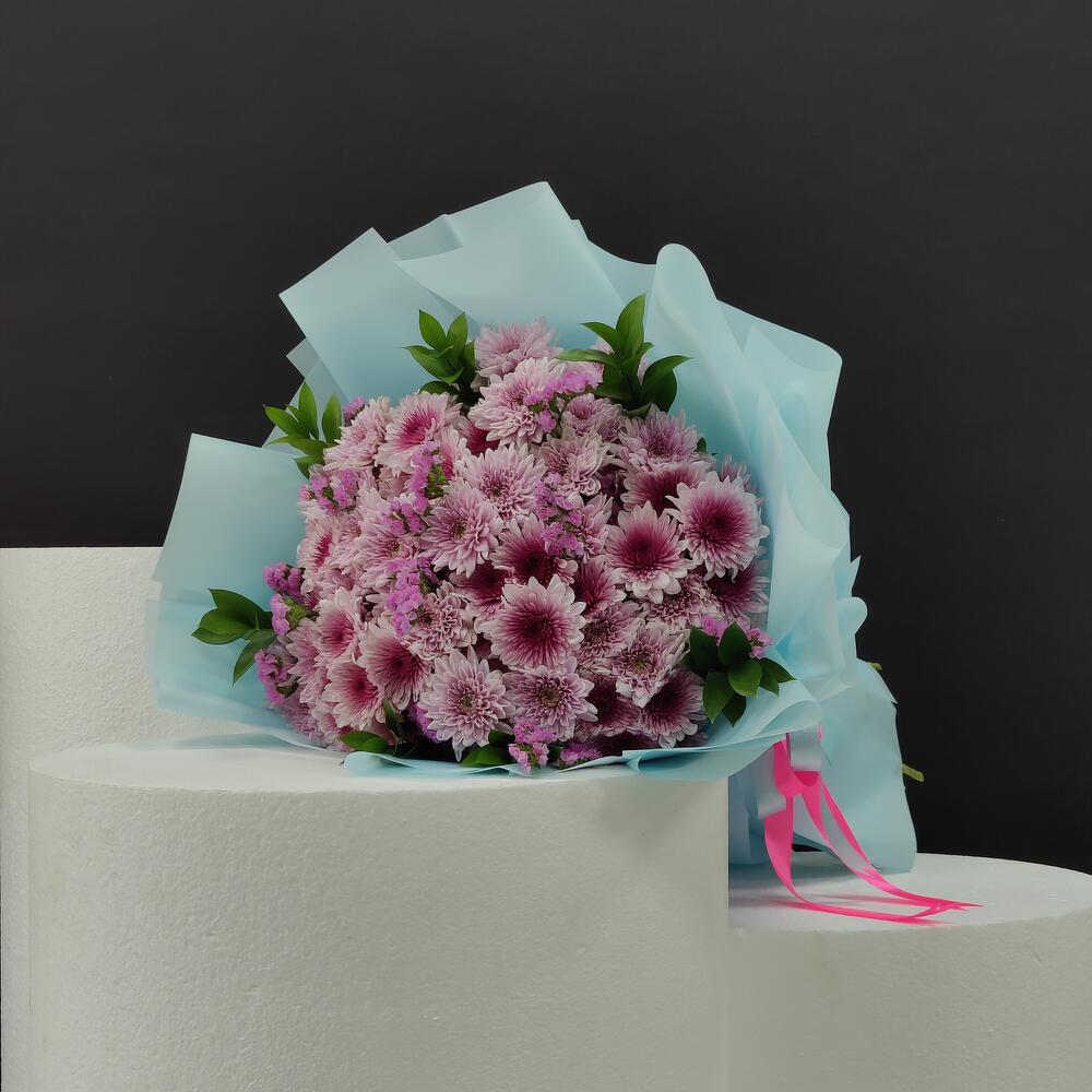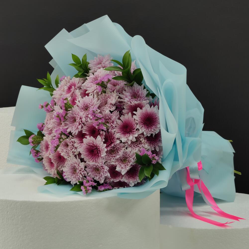 statice pink - 5 pcs ruscus leaves - 7 pcs chrysant. double color pink - 10 pcs