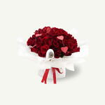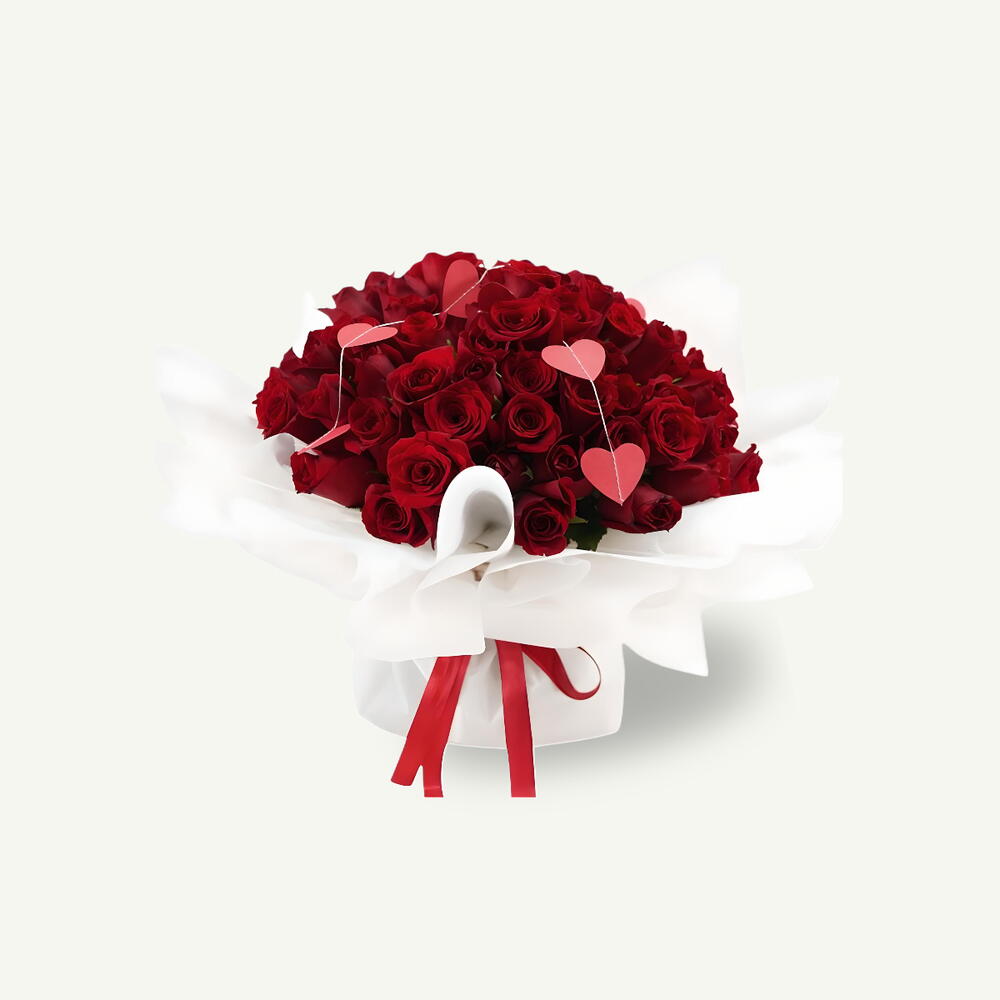 Hand-tied bouquet with 75 fresh red roses and red heart accents gently crafted in white wrapping.