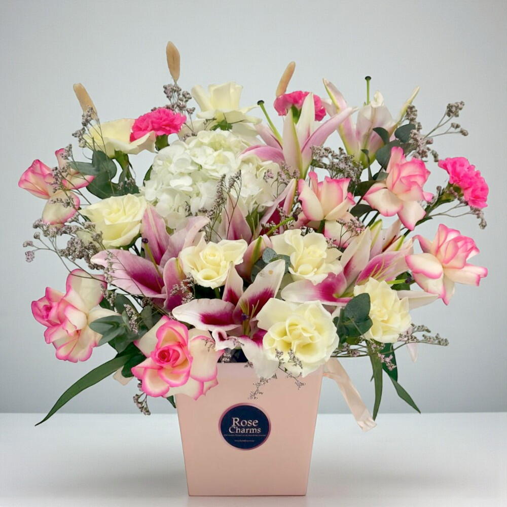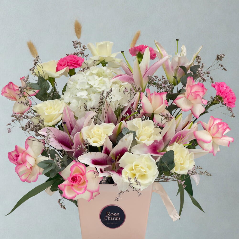A dreamy, feminine gift bag featuring 12 roses, 3 pink lilies, 3 carnations, and white hydrangea arranged in soft harmony. Elegant, fresh, and beautifully styled — perfect for birthdays, anniversaries, heartfelt gestures, and same-day luxury gifting across Dubai. Send soft elegance today — order RC-B355 now and gift a beautifully curated blend of blooms in a stylish floral bag.