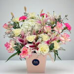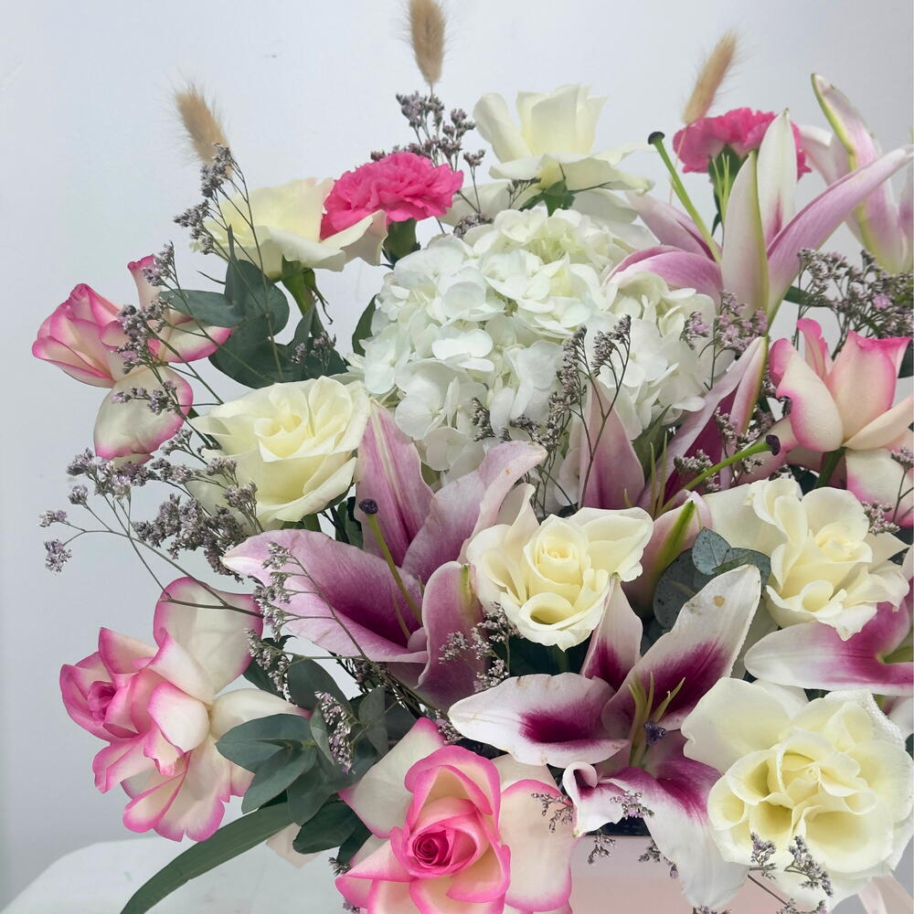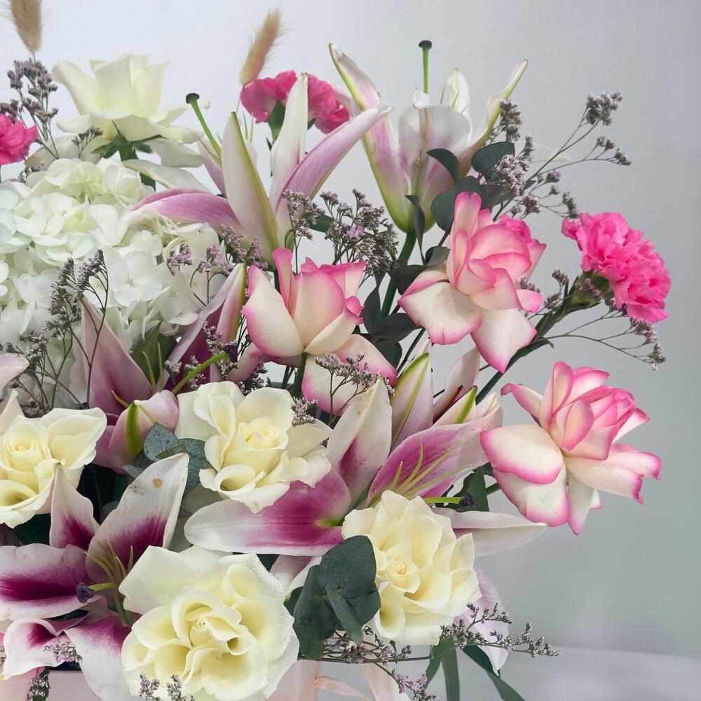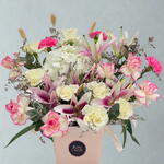 White rose - 6 pcs pink carnation - 3 pcs pink lilies - 3 pcs white hydrangea - 1 pcs bag - 1 pcs pink roses - 6 pcs exotic fillers - 3 pcs