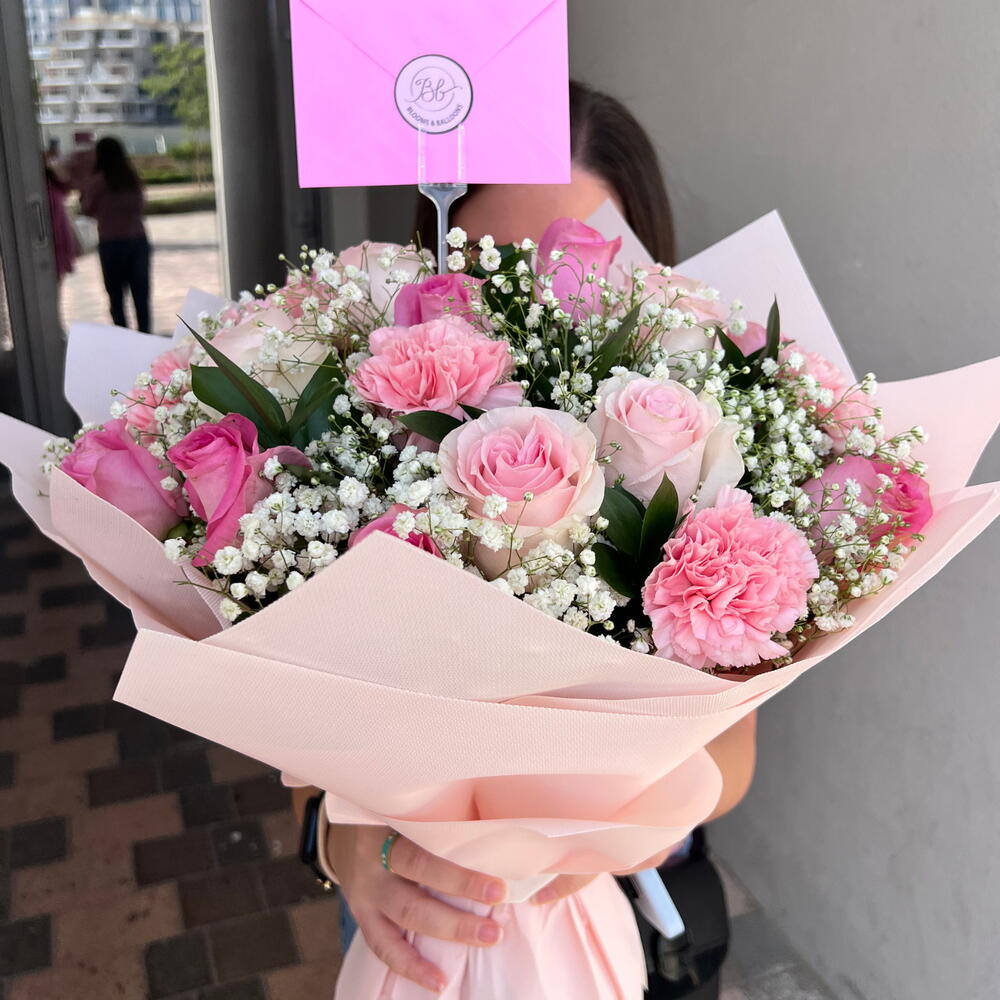 gypsophilia - 8 pcs pink carnation - 8 pcs ruscus leaves - 5 pcs pink roses - 12 pcs