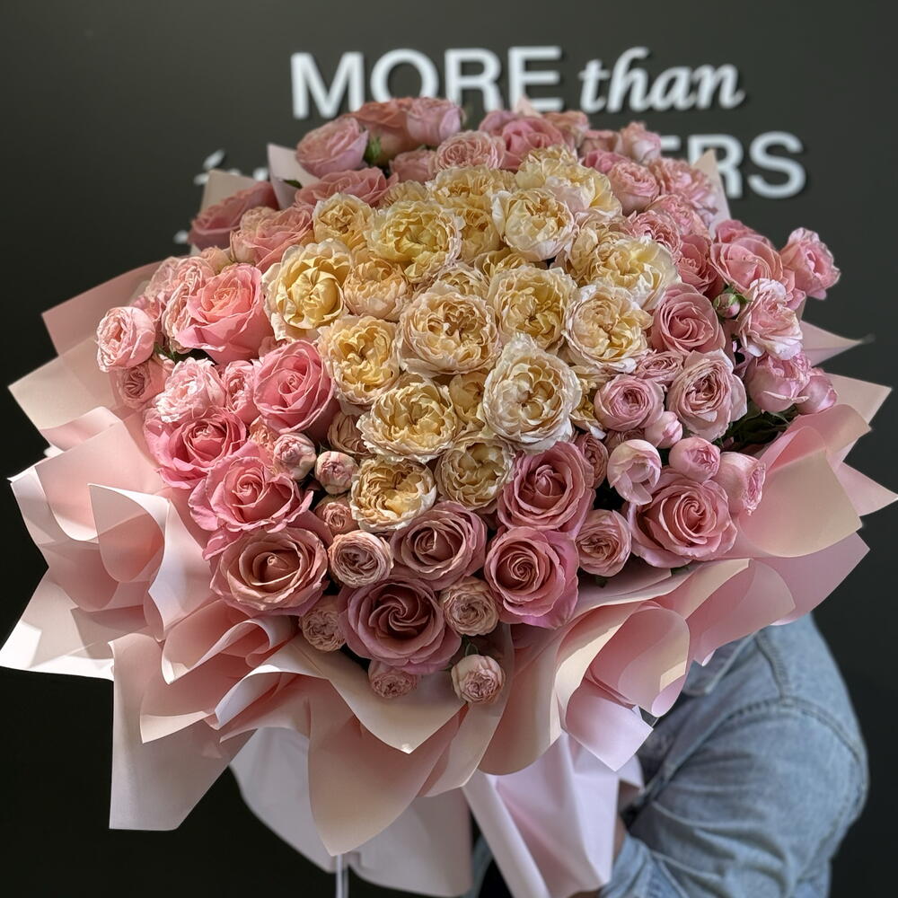 A luxurious, hand-tied bouquet featuring a stunning blend of soft pink and warm peach garden roses. Designed in a full, dome shape, this arrangement highlights premium spray roses and layered petals that create a rich, romantic texture. Wrapped elegantly in blush-toned paper, it’s perfect for birthdays, anniversaries, or heartfelt surprises.