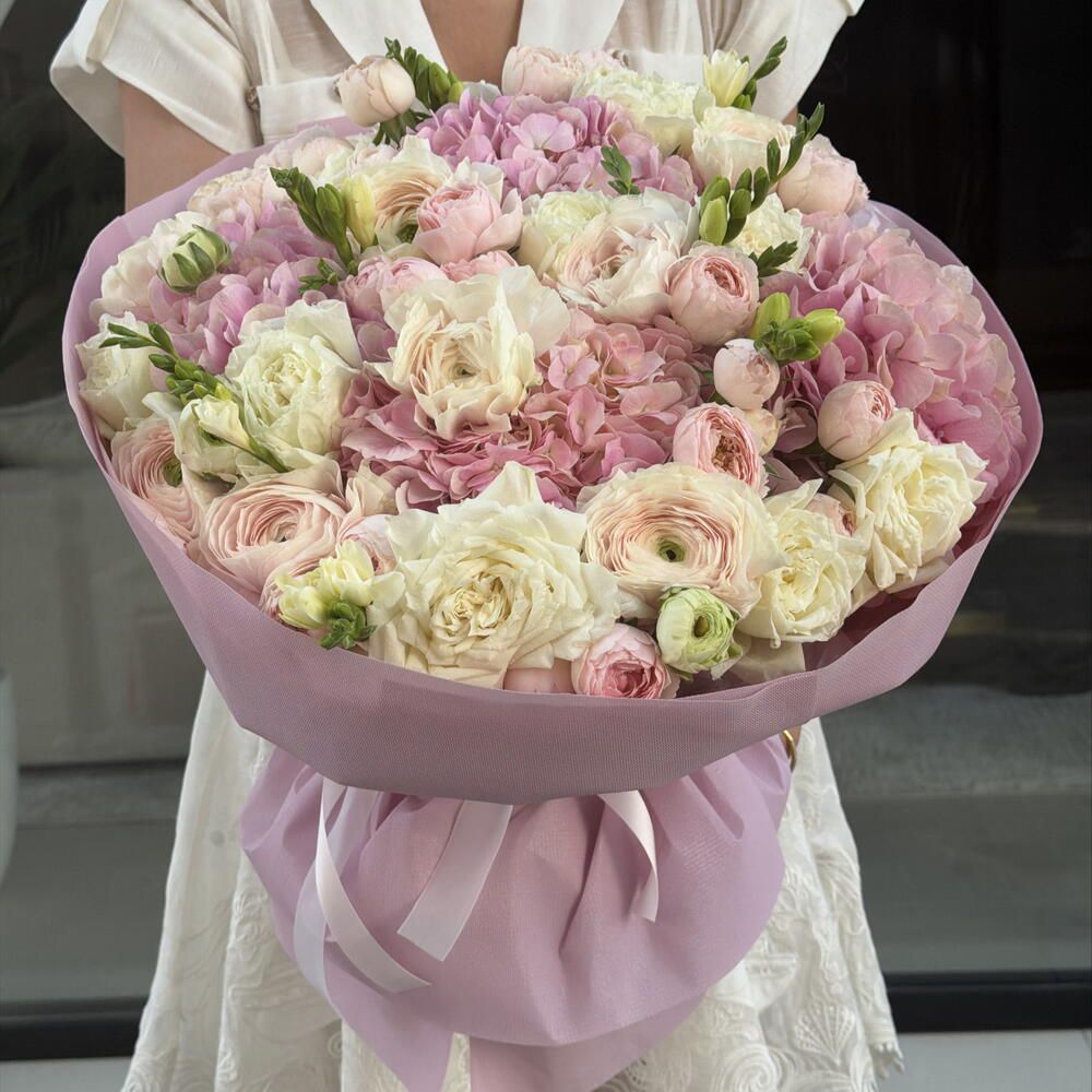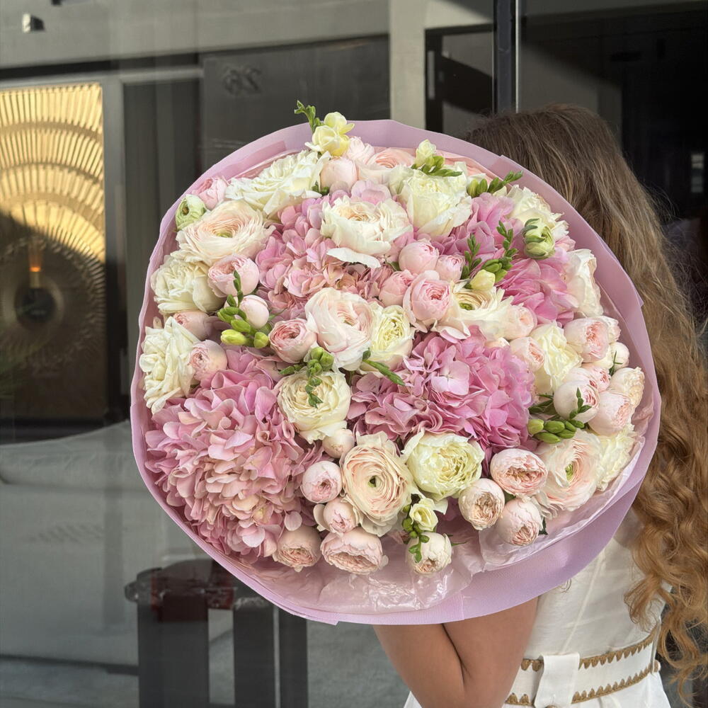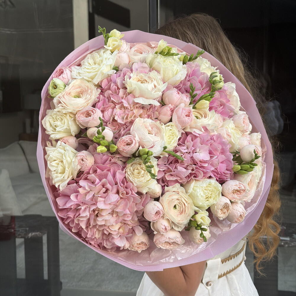 A luxurious, full-bodied bouquet in soft blush and ivory tones, designed to impress at first sight. Voluminous pink hydrangeas create a rich base, complemented by delicate ranunculus, elegant garden roses, and fragrant white freesia. The composition feels airy yet abundant, romantic yet refined — a statement bouquet for grand gestures, celebrations, and unforgettable moments.