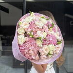 hydrangea pink - 4 pcs freesia white - 7 pcs ranunculus - 10 pcs rose tennick - 8 pcs rose spray mansfield - 8 pcs