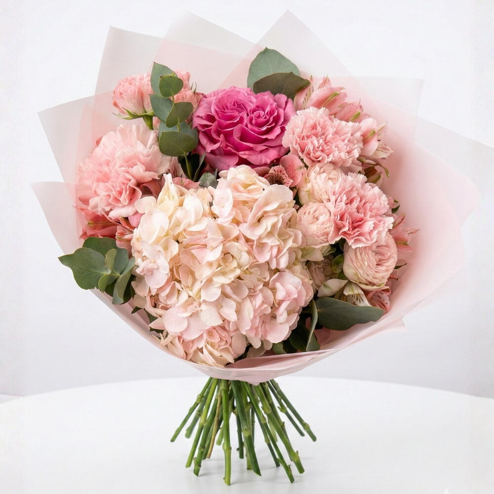 A soft and elegant arrangement featuring 1 pink hydrangea, 5 pink carnations, 3 pink alstroemeria, and 2 pink spray roses. A perfect bouquet for expressing admiration and sweet affection