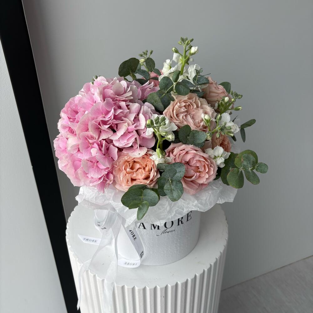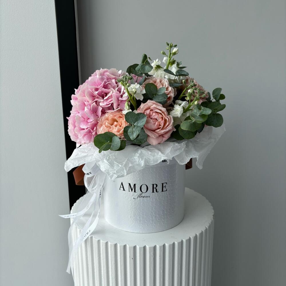 hydrangea pink - 1 pcs eucalyptus leaves - 5 pcs white hatbox - 1 pcs spray rose julietta - 2 pcs matthiola white - 1 pcs