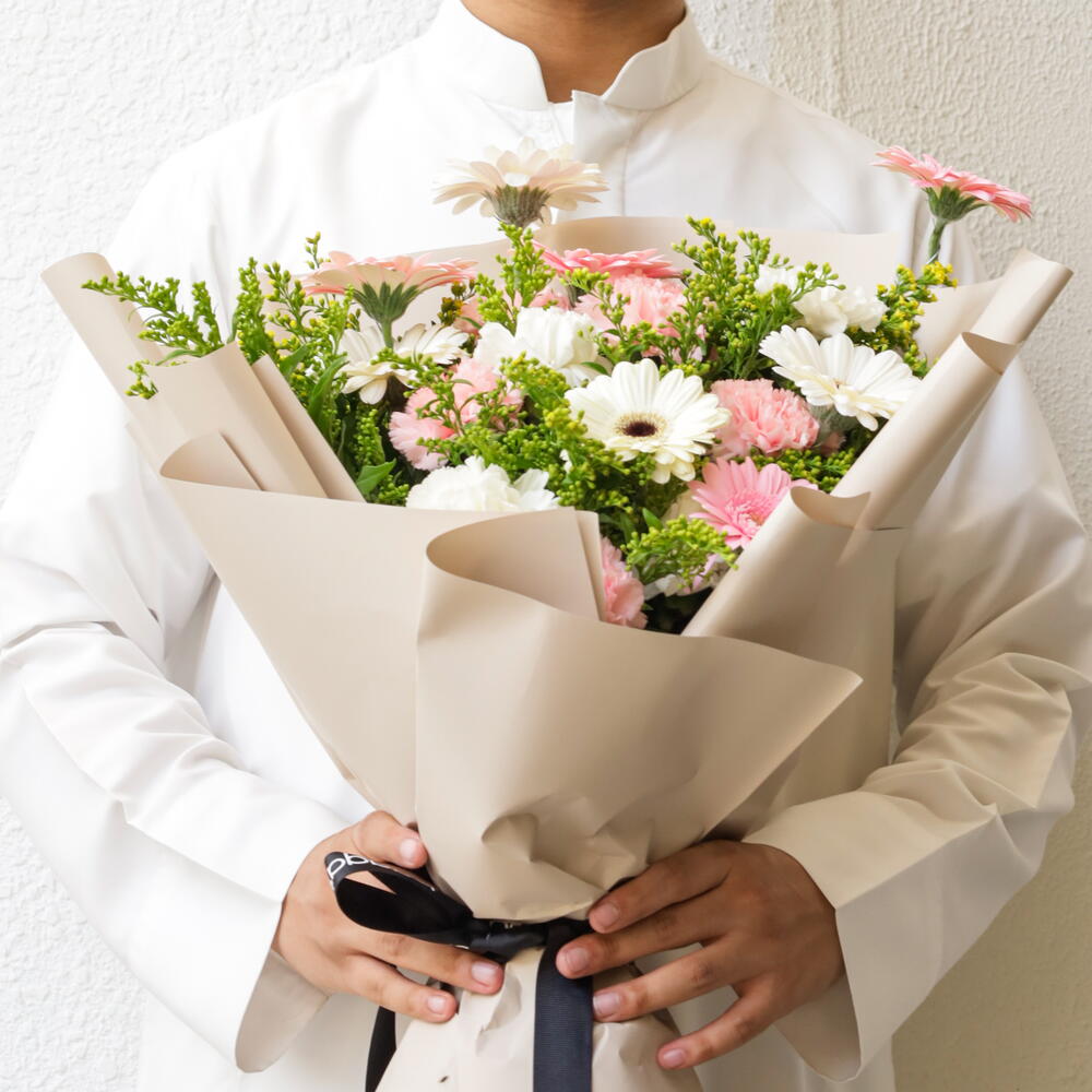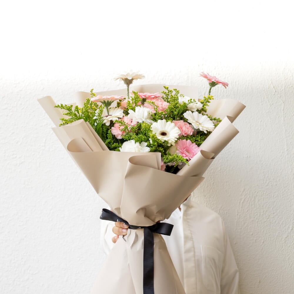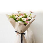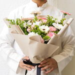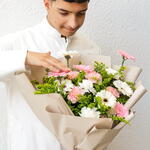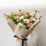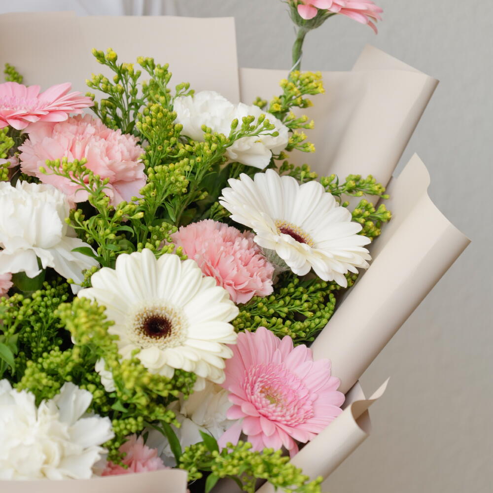 A soft blend of pink and white blooms, wrapped with elegance and love. The Blush Harmony Flower Bouquet is a graceful arrangement featuring delicate pink and white Gerbera daisies, soft pink carnations, and fresh green fillers. Wrapped in premium beige paper and finished with a black ribbon, this bouquet is perfect for birthdays, anniversaries, congratulations, or simply to brighten someone’s day. Its gentle colors symbolize admiration, purity, and heartfelt affection. Flower Care Tips 🌿 To keep your bouquet fresh and beautiful for longer: 1. Trim the stems at a 45° angle before placing them in water. 2. Use clean water and change it every 1–2 days. 3. Remove leaves that sit below the water line to prevent bacteria. 4. Keep the bouquet away from direct sunlight, heat, and air conditioners. 5. Lightly mist the flowers once a day for added freshness.