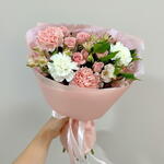 Ribbon - 1 pcs Wrapping - 4 pcs pink alstroemeria - 5 pcs pink carnation - 2 pcs pink baby rose - 4 pcs white carnation - 2 pcs eucalypstus - 4 pcs