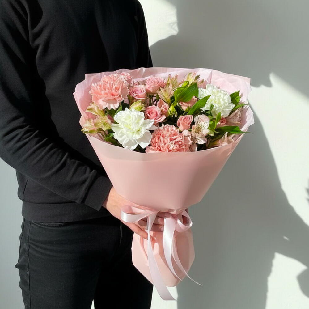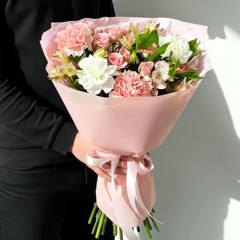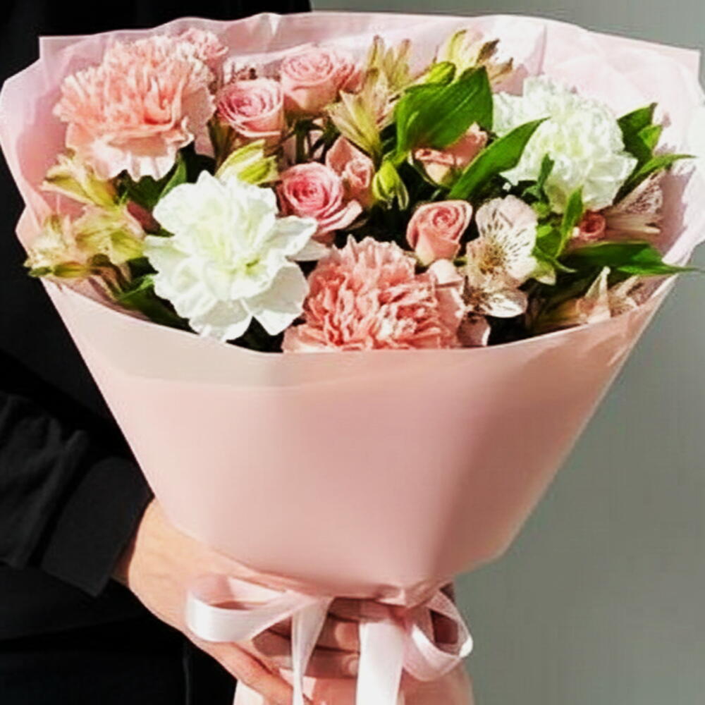 Ribbon - 1 pcs Wrapping - 5 pcs pink carnation - 2 pcs white carnation - 2 pcs pink alstroemerias - 3 pcs pink baby roses - 4 pcs
