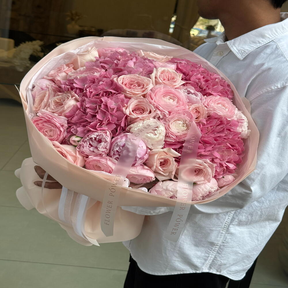 5 Hydrangea light pink, 12 Rose Ohara Pink, 8 Peony Sarah, 10 Ranunculus cherry Pink. Designed in a premium L bouquet style (40–50 cm) with elegant wrapping and ribbon finish.
