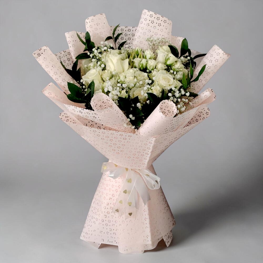 This sophisticated arrangement features a dense cluster of creamy white roses and delicate spray roses, beautifully accented with airy sprigs of baby's breath and deep green foliage. The bouquet is masterfully presented in a unique blush pink sculptural wrap adorned with a delicate, laser-cut floral pattern and finished with a shimmering white organza ribbon featuring gold heart details.