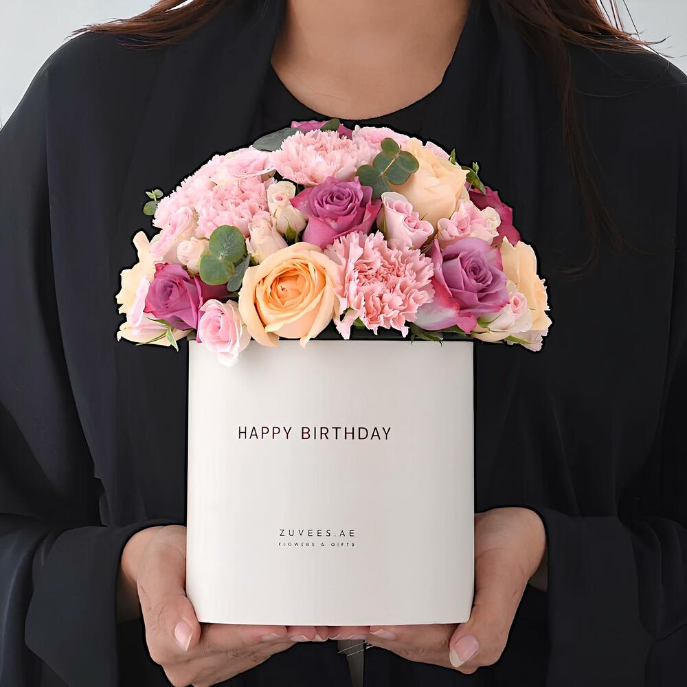 a charming mix of roses, carnations, and lisianthus in pastel shades, perfectly paired with a delicious tiramisu cake and festive accessories. A complete birthday surprise in one luxurious set!