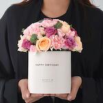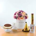 Eucalyptus - 5 pcs pink carnations - 6 pcs cake - 1 pcs white lisianthus - 4 pcs peach roses - 6 pcs purple roses - 5 pcs pink spray roses - 6 pcs party popper - 1 pcs box of colorful birthday candles - 1 pcs birthday hat - 1 pcs
