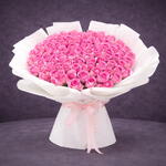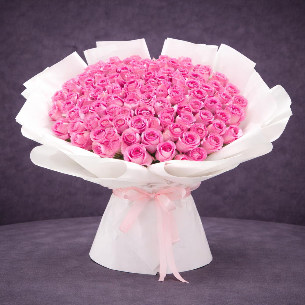 An extraordinary bouquet of 101 premium pink roses, arranged in a flawless dome shape and wrapped in elegant white luxury paper. Finished with a soft blush satin ribbon, this grand design radiates romance, admiration, and timeless elegance.