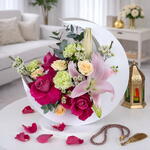 A graceful Ramadan-inspired floral arrangement beautifully styled in a modern Forex moon-shaped stand, symbolizing serenity and celebration. This artistic composition features 3 dark pink roses for richness and romance, paired with 1 stem of peach baby roses adding softness and warmth. A stunning 1 stem Oriental lily creates a focal point with its delicate blush petals, while 3 green carnations bring freshness and texture to the design. Accented with 1 stem of white wax flowers, the arrangement gains a touch of lightness and delicate charm. Thoughtfully balanced in color and form, this crescent-inspired floral piece is perfect for Ramadan décor, Eid gifting, or elevating a refined indoor setting with elegance and meaning.