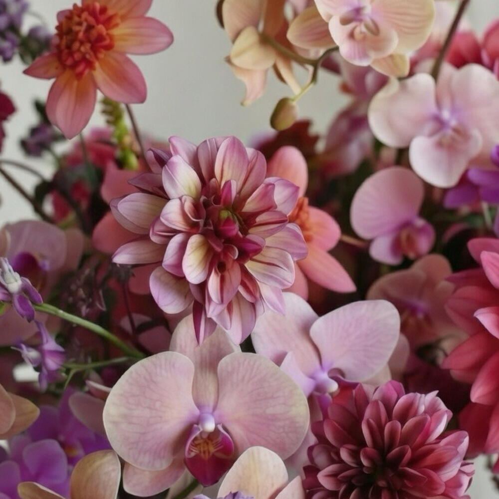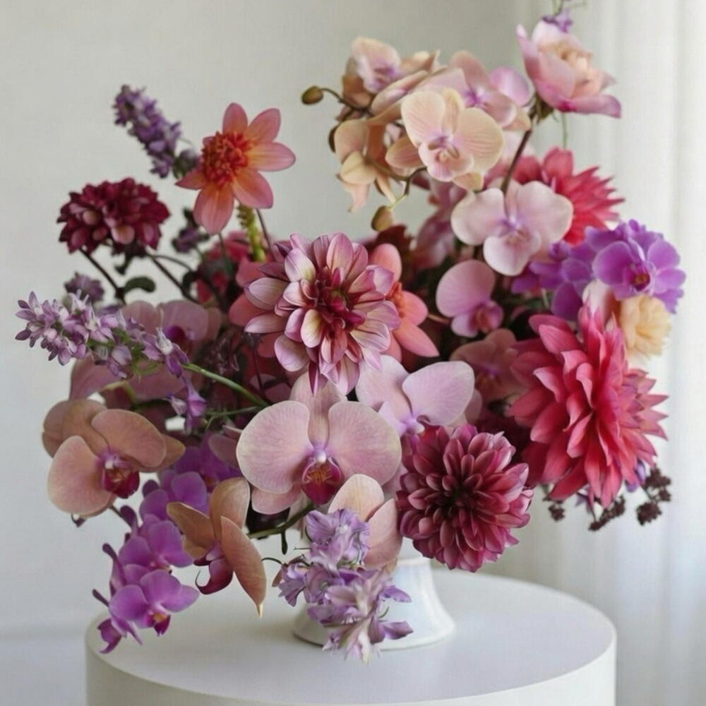 Blush Orchid Symphony is a refined designer arrangement featuring elegant phalaenopsis orchids paired with lush seasonal dahlias in soft blush, lavender, and deep berry tones. The composition balances airy movement with rich floral texture, creating a modern romantic aesthetic. Arranged in a matte white pedestal vase, this piece is ideal for luxury interiors, gifting, or statement décor. The color palette blends softness with depth, making it suitable for sophisticated home styling or premium floral gifting in Dubai.