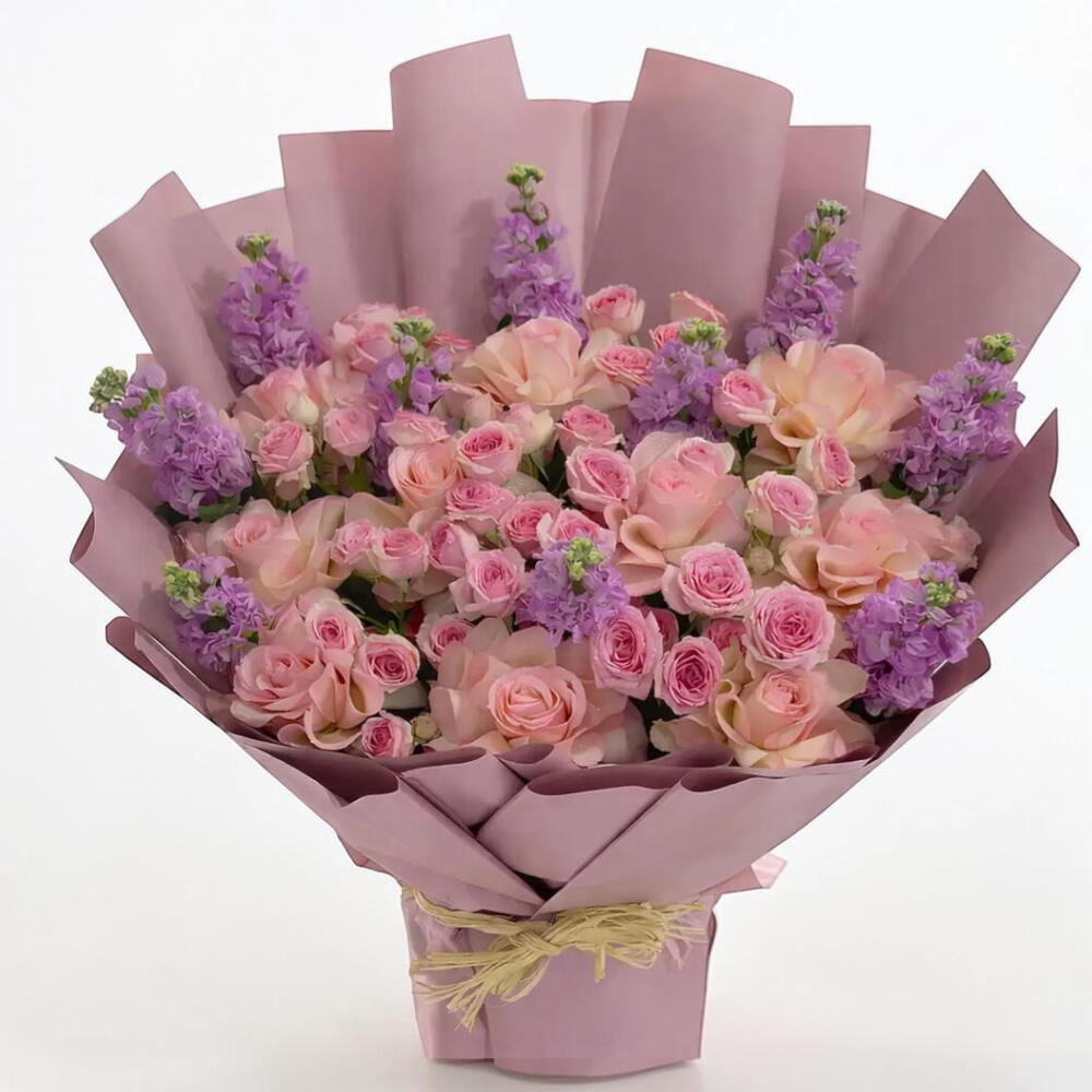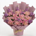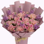 Bouquet of 10 pink rose, 10 pink spray rose, 10 purple mathiola with fillers in a nice wrapping.