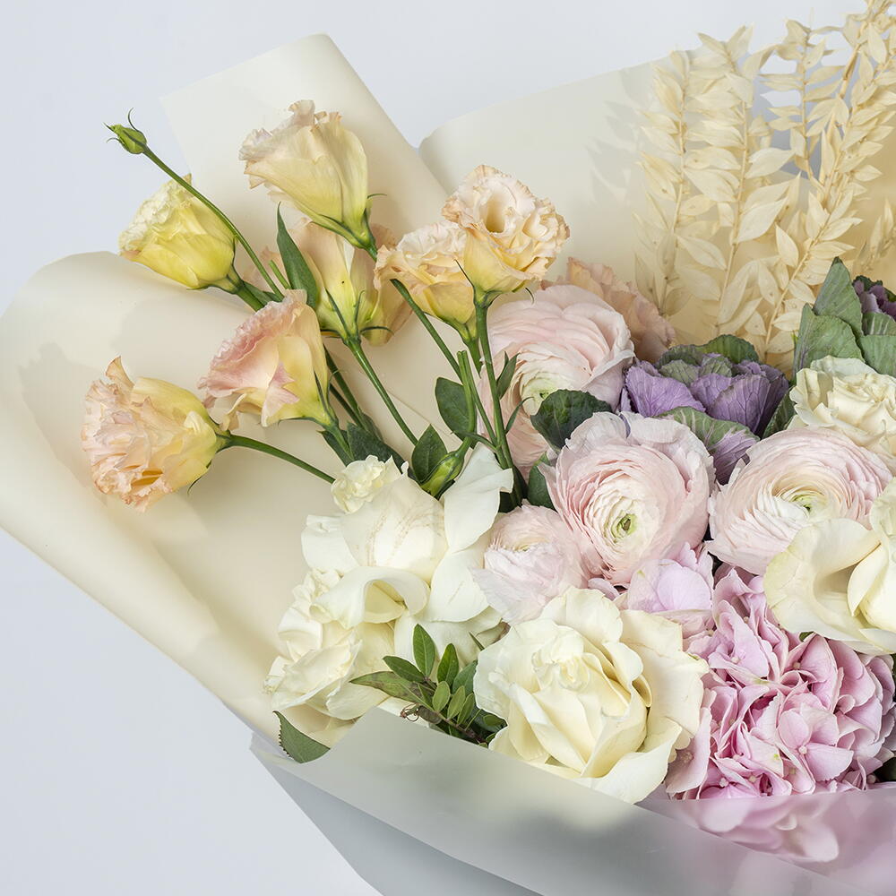 White rose - 4 pcs hydrangea pink - 2 pcs ranunculus pink - 4 pcs anthurium peach - 1 pcs lecanthus peach - 4 pcs cabbage flower - 2 pcs