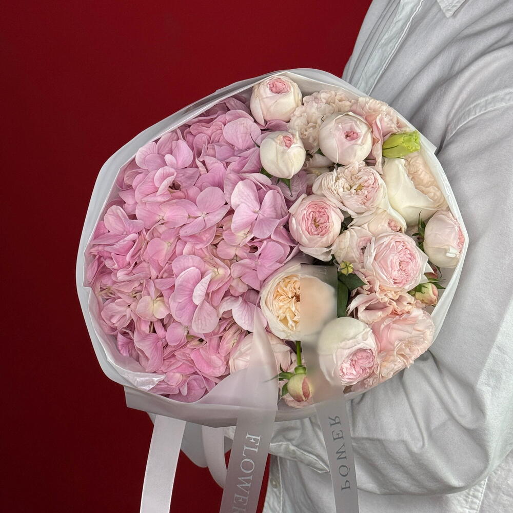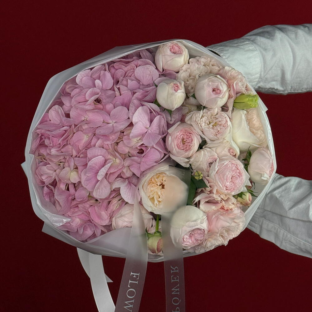 Eustoma - 2 pcs rose - 2 pcs spray roses - 3 pcs hydrangeas light pink - 1 pcs
