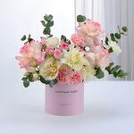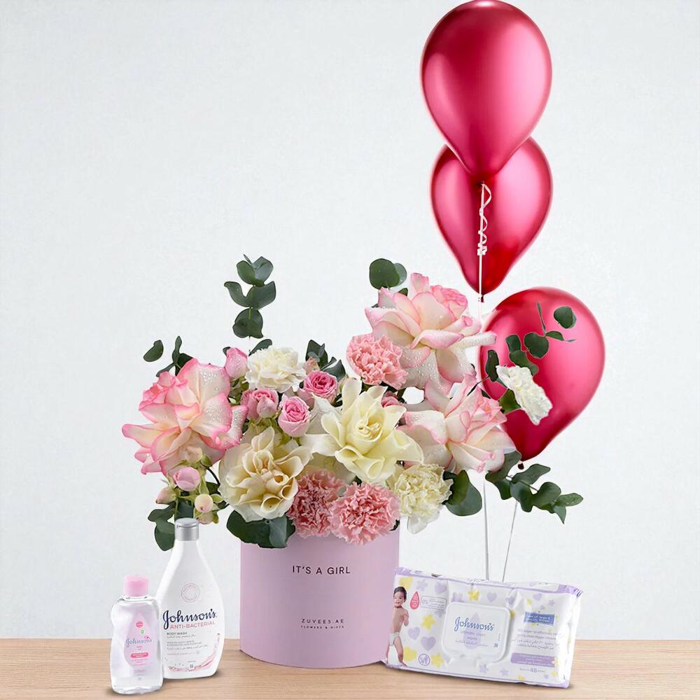 Celebrate the arrival of a precious baby girl with this delightful gift set. A soft arrangement of pink and cream roses with carnations, complemented by eucalyptus and lush greens, beautifully presented in a pastel pink box. Paired with festive balloons and Johnson’s baby essentials, this set makes the perfect gift to welcome a little princess into the world.