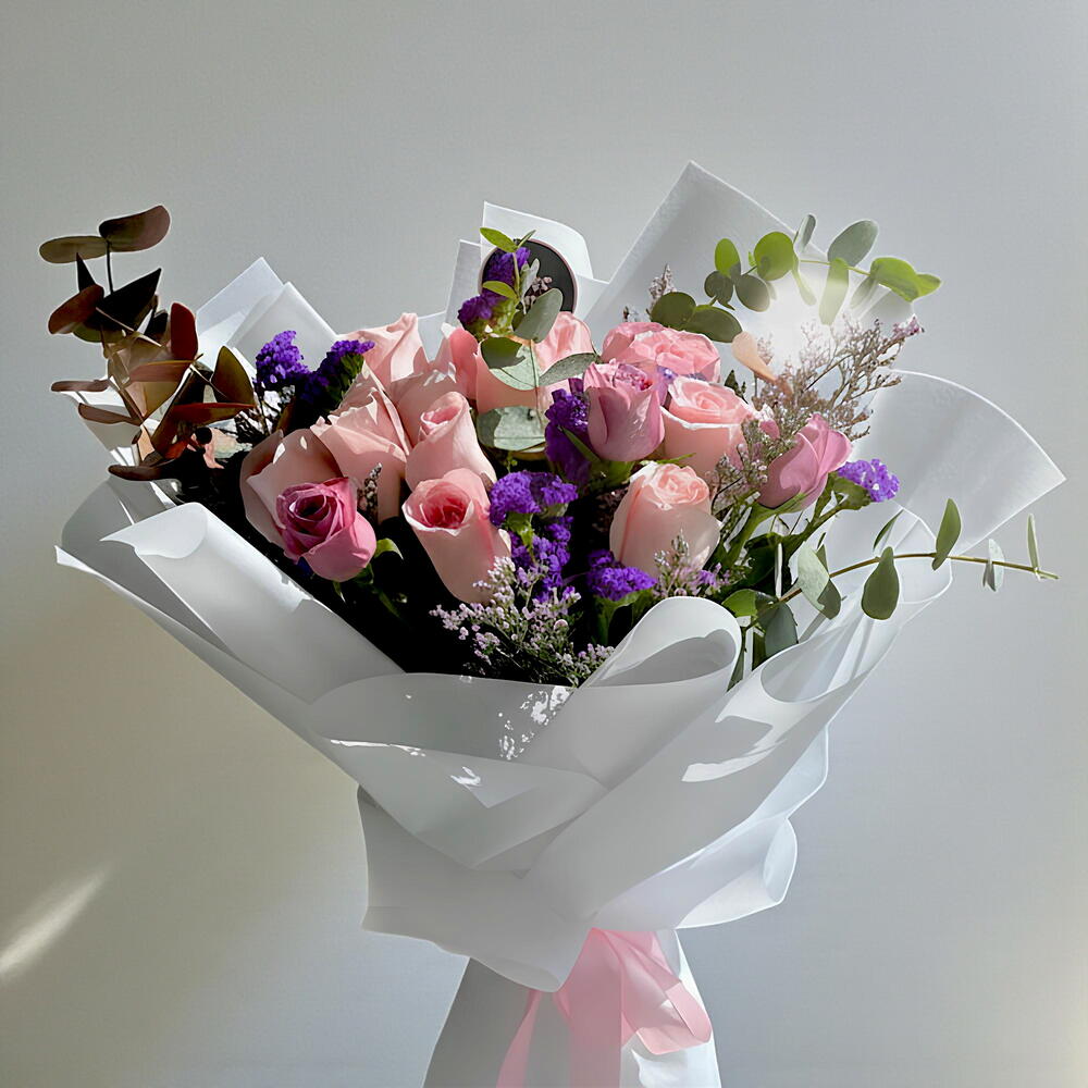 Limonium - 1 pcs Pink rose - 9 pcs purple rose - 9 pcs eucalyptus leaves - 2 pcs purple statice - 2 pcs
