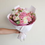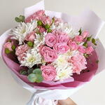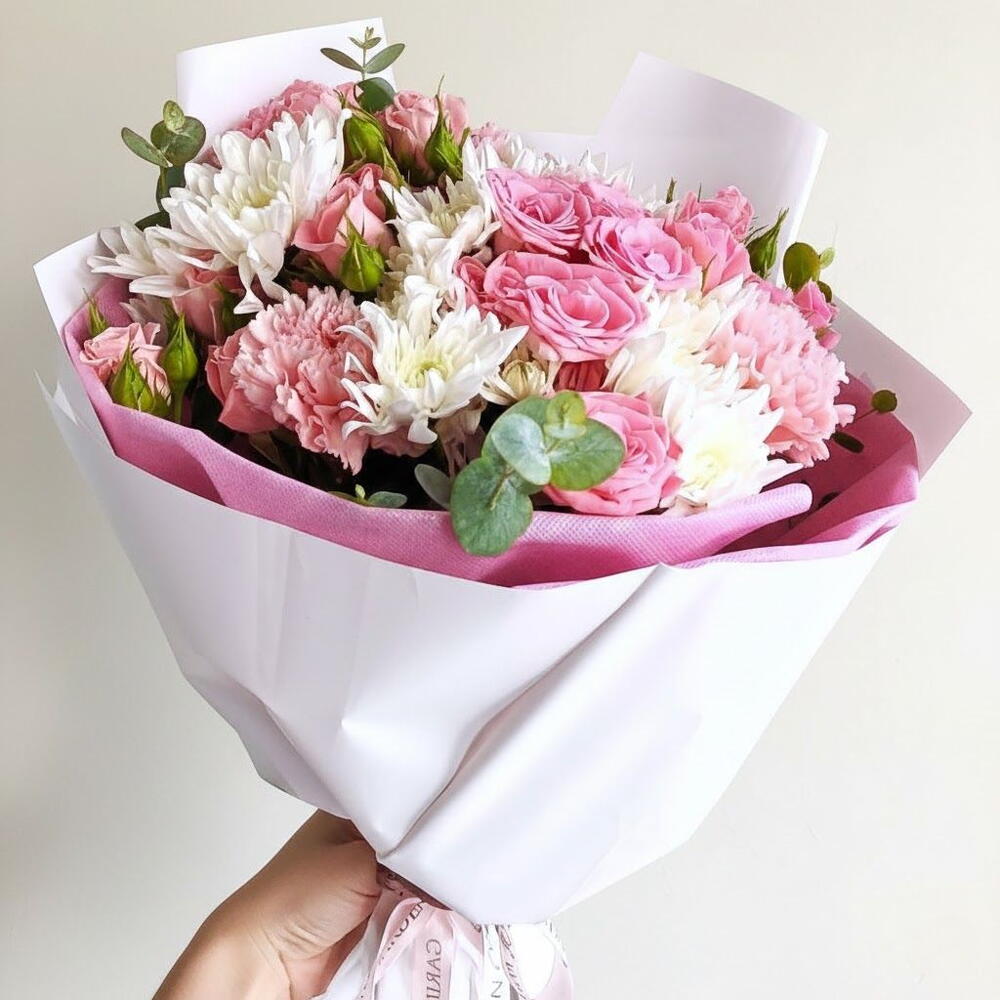Ribbon - 1 pcs Eucalyptus - 3 pcs pink carnations - 3 pcs white chrysanthemum - 4 pcs wrapping paper - 3 pcs tissue - 1 pcs pink spray roses - 4 pcs