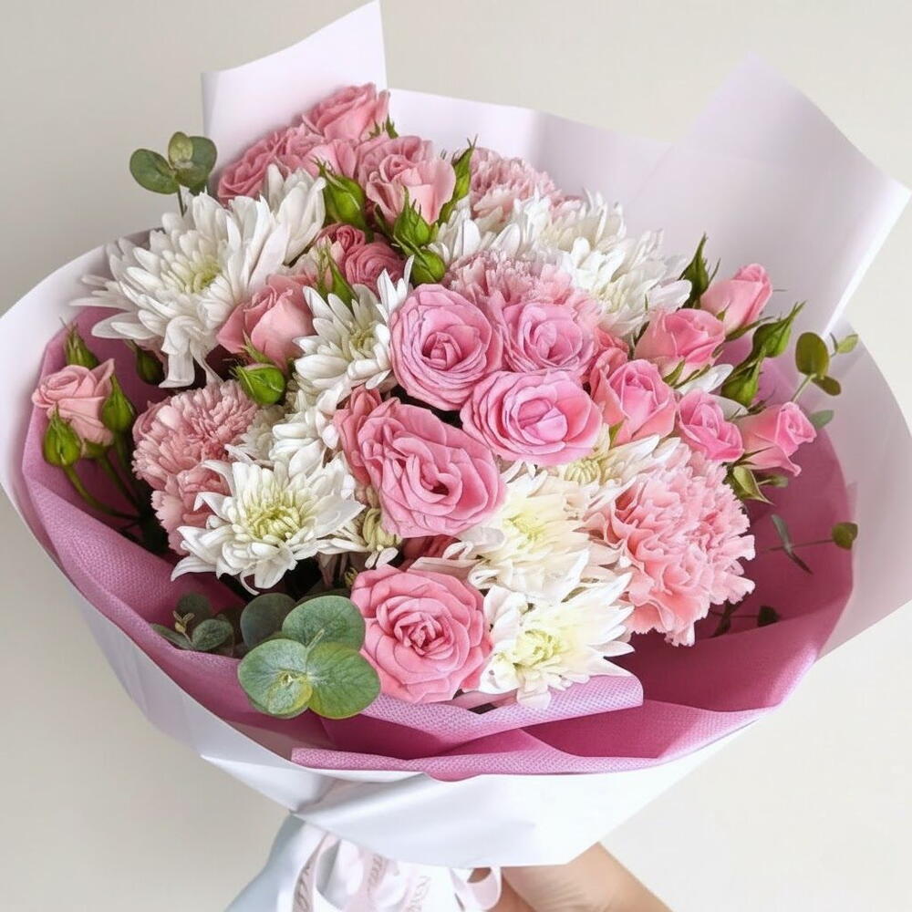 A graceful bouquet blending soft pink and pure white blooms, designed to bring sweetness, calm, and romantic elegance into any moment. Featuring fresh pink spray roses, delicate carnations, and fluffy white chrysanthemums, this bouquet is the perfect gesture for birthdays, gratitude, love, or “just because.” Soft, uplifting, and effortlessly beautiful — a bouquet that whispers tenderness into their day. Send this soft, romantic bouquet today — guaranteed to brighten their heart.