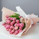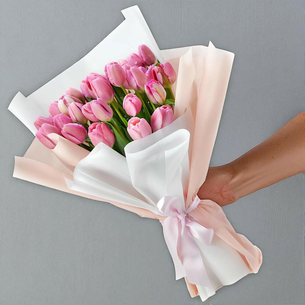 Soft pink tulips bouquet wrapped in rich cream paper