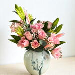 đ¸ Blushing Bloom Pot â Pink Roses Lilies | Elegant Flower Arrangement Dubai