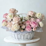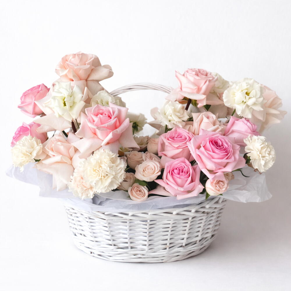 A soft, graceful basket of pink and white roses paired with delicate carnations, styled in pastel tones for effortless elegance. Perfect for birthdays, thank-you moments, gentle celebrations, and everyday expressions of care.