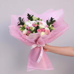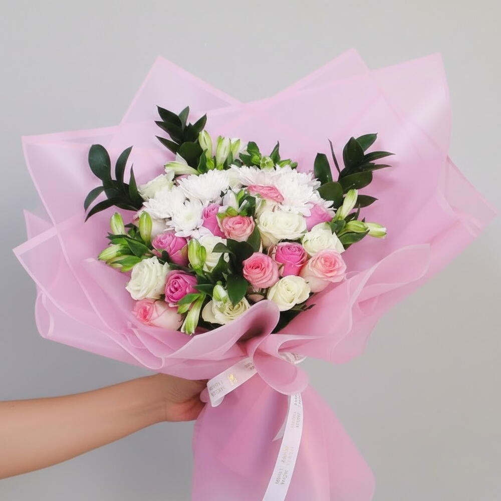 A graceful and charming bouquet featuring a delicate mix of roses, chrysanthemums, and alstroemeria, wrapped in soft pink packaging. Perfect for celebrating birthdays, anniversaries, and special moments, this arrangement brings a touch of elegance and beauty to any occasion. Trim the stems and place the bouquet in clean water upon arrival. Change water every two days and keep the flowers in a cool, shaded area. Avoid direct sunlight and heat sources to extend freshness.