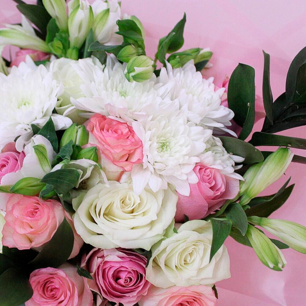 Ruscus - 4 pcs Alstroemeria - 5 pcs White rose - 7 pcs white chrysanthemum - 2 pcs pink roses - 12 pcs