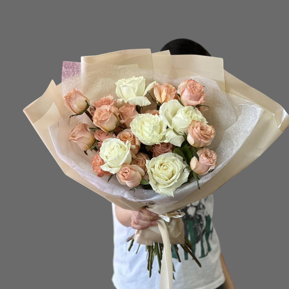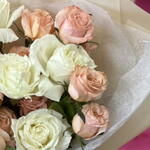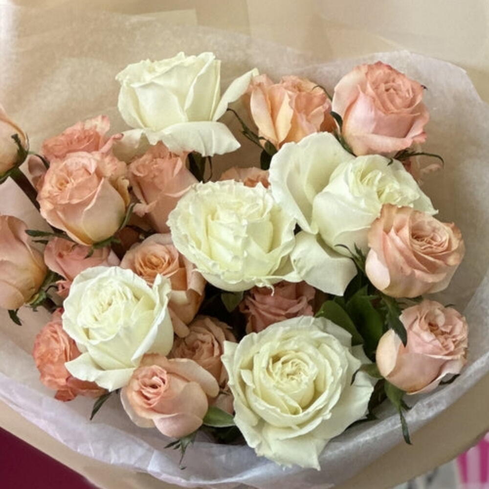 Blushing Romance Bouquet Embrace the warmth of a sunset with this bouquet. This enchanting arrangement features: 5 White Roses: Deep and passionate, symbolizing love and admiration. 16 Peach Roses: Soft and delicate, adding a touch of sweetness and grace. Perfect for anniversaries, celebrations, or simply to brighten someones day, this bouquet embodies warmth and beauty, making it a heartfelt gift for loved ones or a stunning centerpiece for your home! Note: If a particular flower, packaging wrap or box is not in stock, a close substitute of similar value, shape and color will be used instead