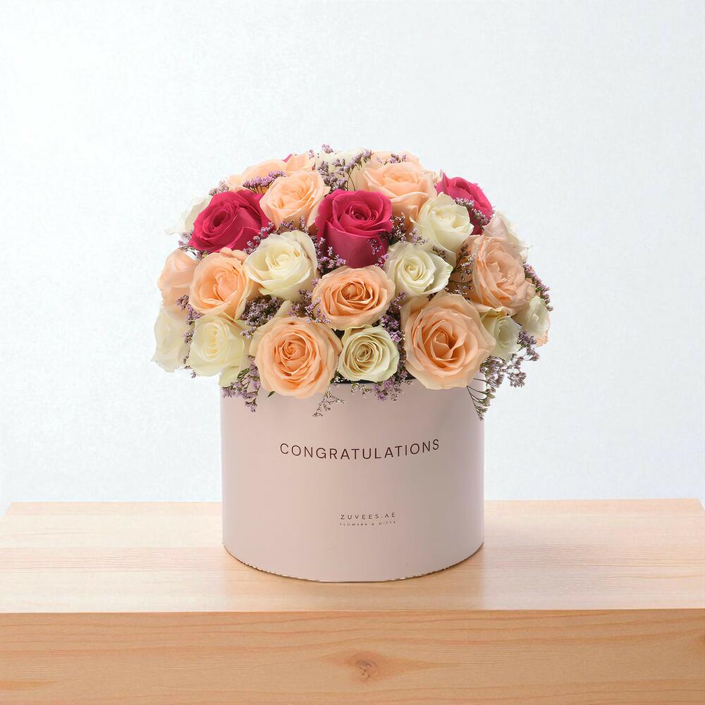Celebrate life’s proudest moments with the Blushing Rose Garden Congratulations Box — a luxurious floral arrangement that exudes elegance, pride, and heartfelt joy.
