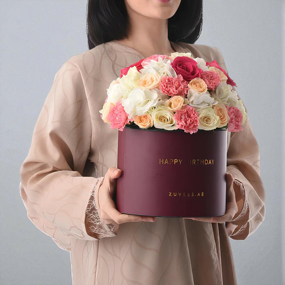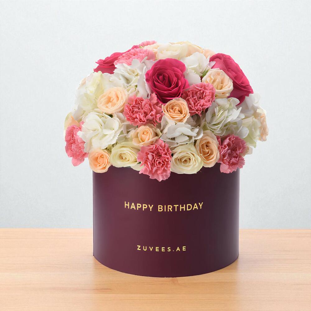 Celebrate birthdays with grace, elegance, and heartfelt warmth through the Blushing Rose Garden – Zuvees Signature Birthday Box, a radiant floral masterpiece crafted to make birthdays truly unforgettable. Bursting with soft pastels and lush romance, this stunning arrangement is presented in our iconic deep burgundy Zuvees Signature Birthday Box—now inscribed with a gleaming “HAPPY BIRTHDAY” for the perfect celebratory touch.
