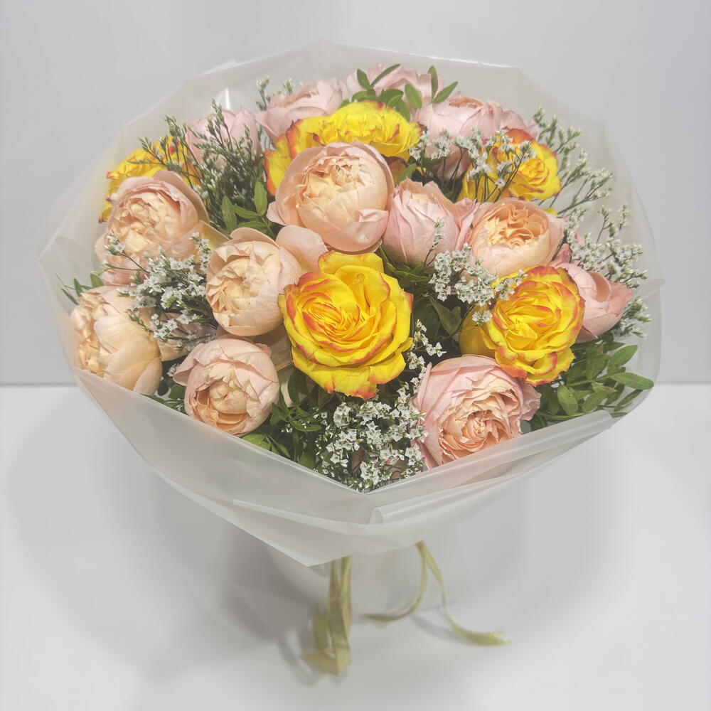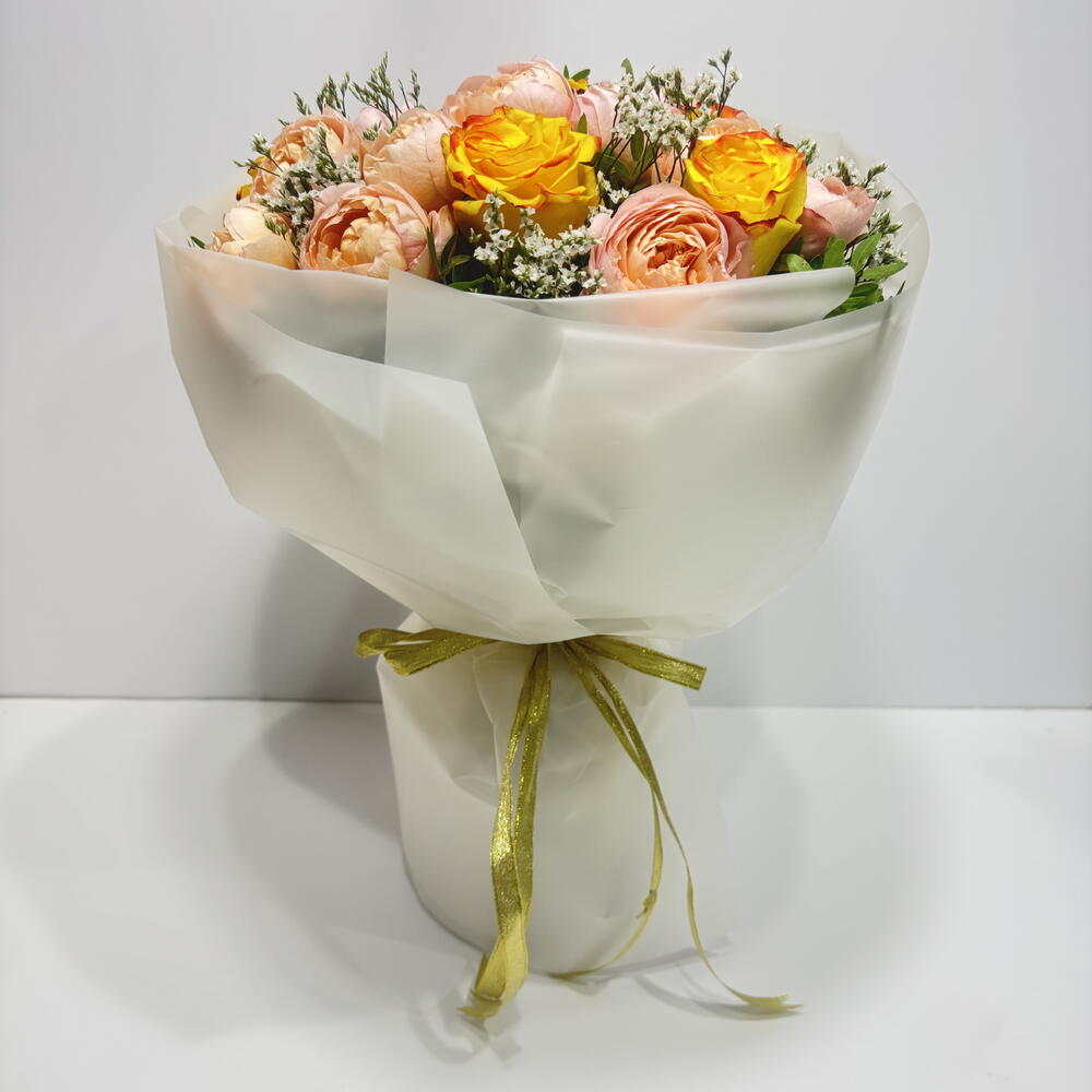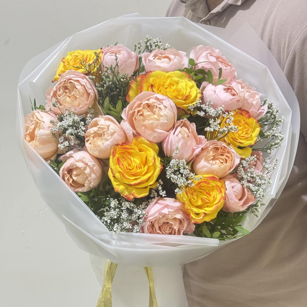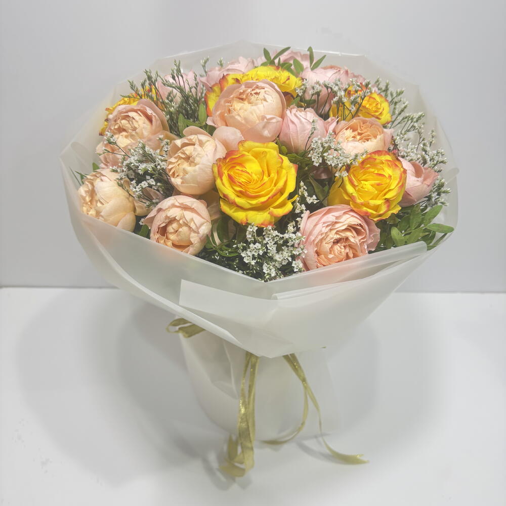 Blushing Sunrise is a captivating blend of romantic blush pink roses paired with sunny yellow-orange roses, symbolizing both warmth and affection. Babys breath adds a touch of grace, while the elegant white wrapping highlights the beauty of the blooms. Perfect for occasions that celebrate love, new beginnings, or simply to brighten someone’s day with a touch of elegance and charm.