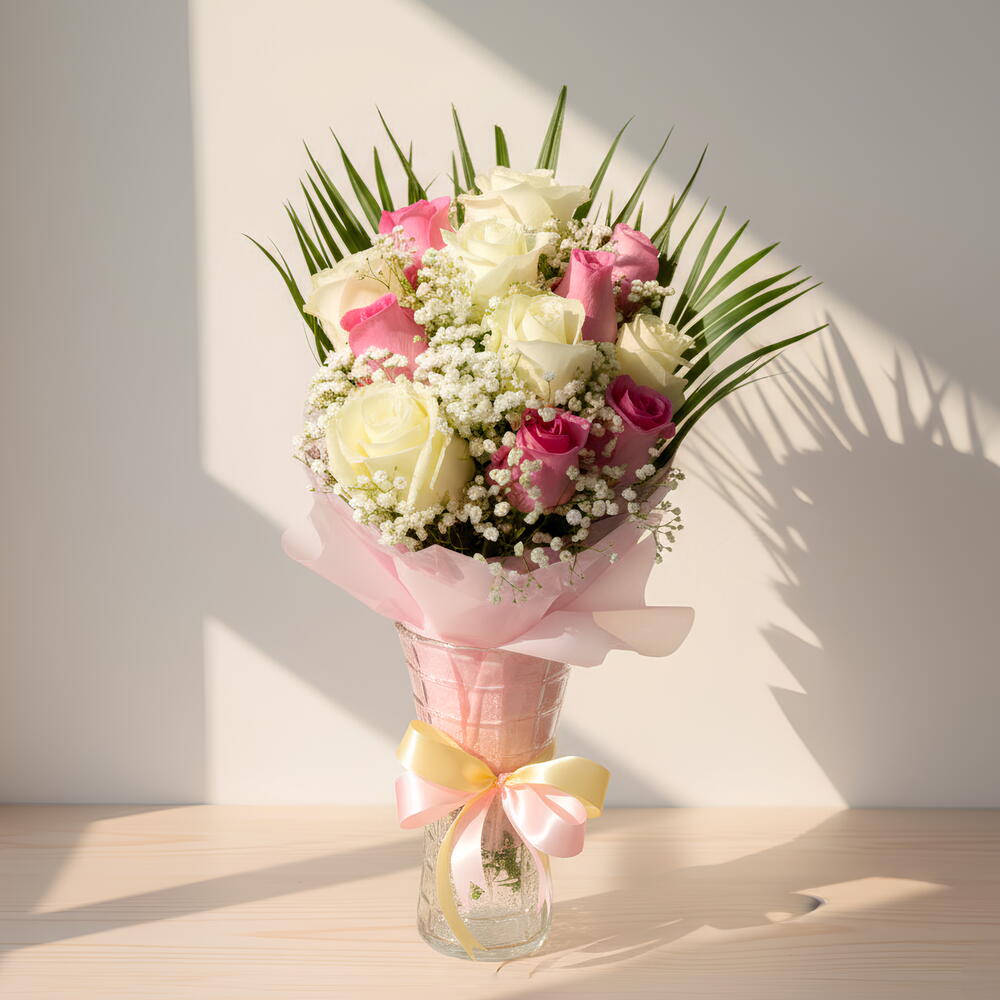 Pink rose - 6 pcs White rose - 6 pcs Gypsophila - 7 pcs palm leaves - 3 pcs
