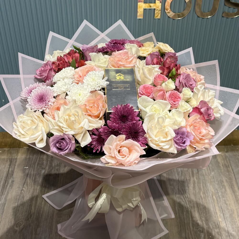 Chrysanthemum white - 1 pcs baby rose pink - 1 pcs esperance pink - 7 pcs white roses - 9 pcs deep purple roses - 8 pcs baby roses white - 1 pcs chysanthemum purple - 2 pcs chysanthemum pink - 1 pcs purfume long lasting - 1 pcs astomeria red - 2 pcs
