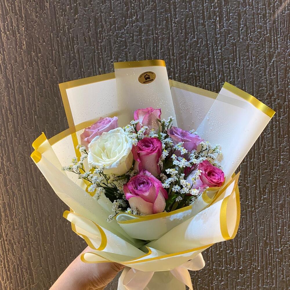 purple rose - 2 pcs jumilia rose - 4 pcs limonium white - 3 pcs white roses - 1 pcs