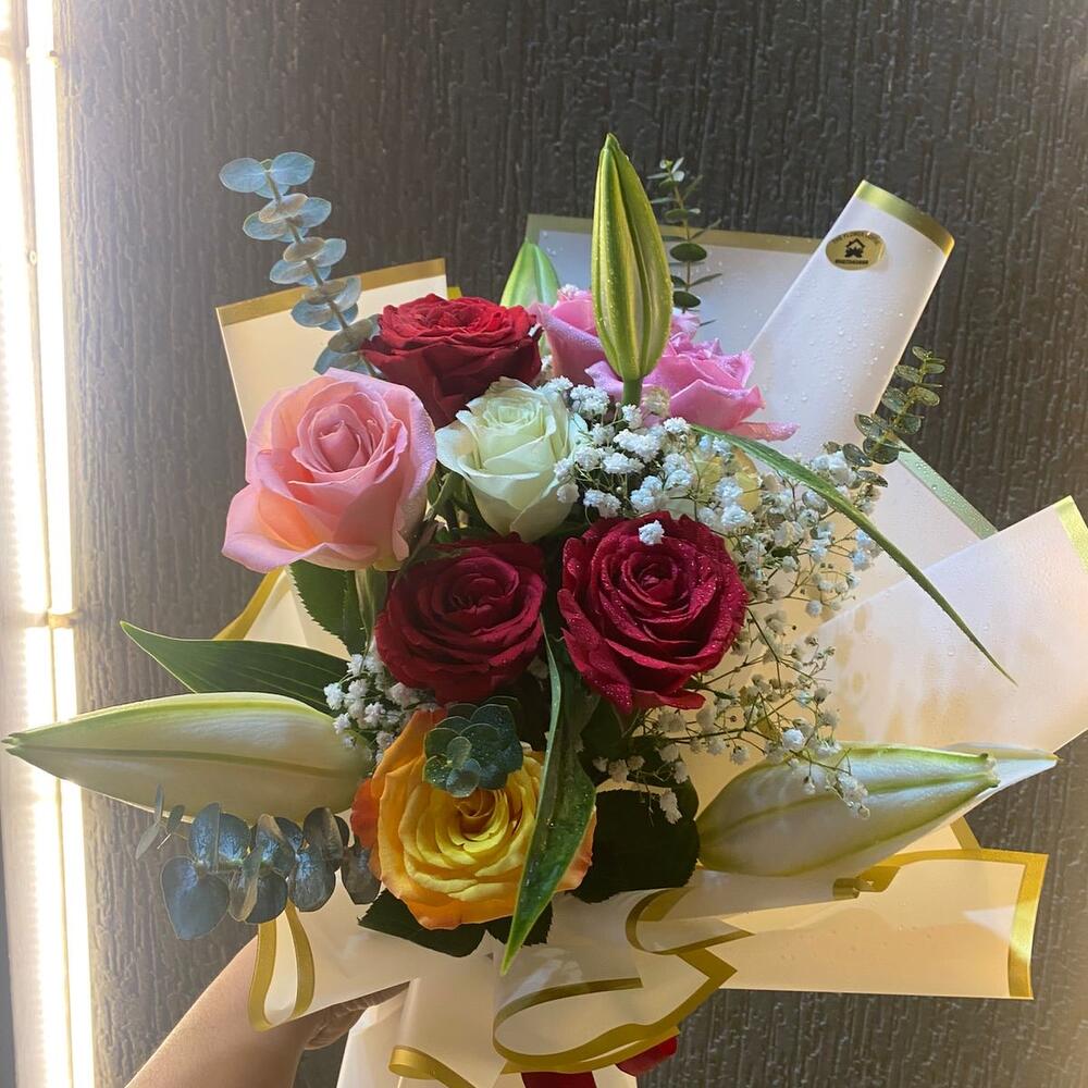 Eucalyptus - 5 pcs White rose - 1 pcs lily white - 1 pcs orange rose - 1 pcs gipso - 2 pcs red roses - 3 pcs pink roses - 3 pcs