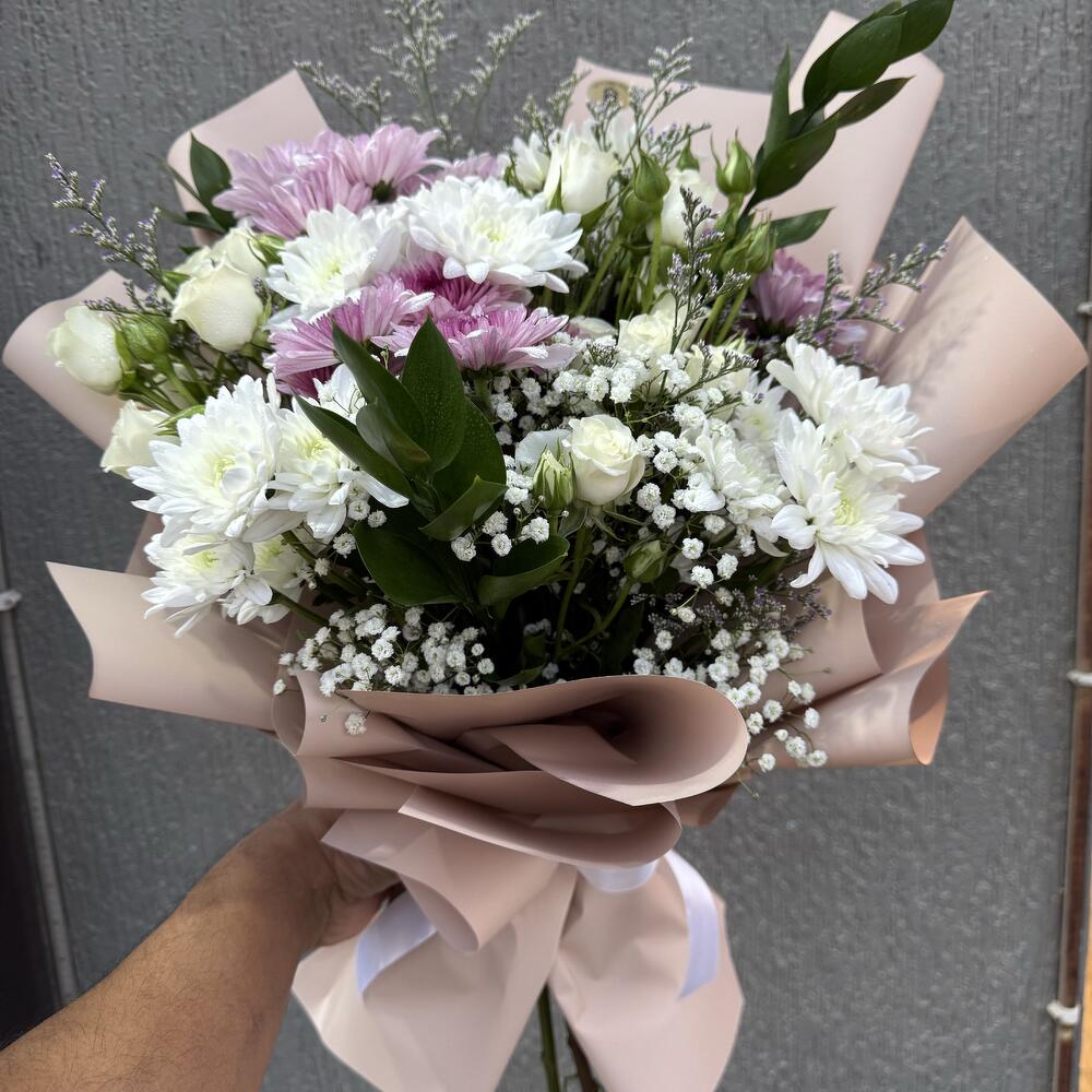 Chrysanthemum white - 3 pcs baby rose white - 3 pcs gipso - 3 pcs chrysanthemum double colour pink - 3 pcs