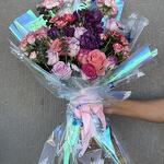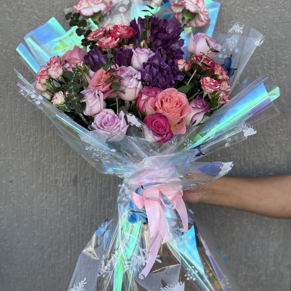 Eucalyptus - 5 pcs Pink rose - 5 pcs carnation - 2 pcs baby rose double color - 3 pcs harmosa rose - 2 pcs astomeriya purple - 3 pcs double color pushya - 3 pcs